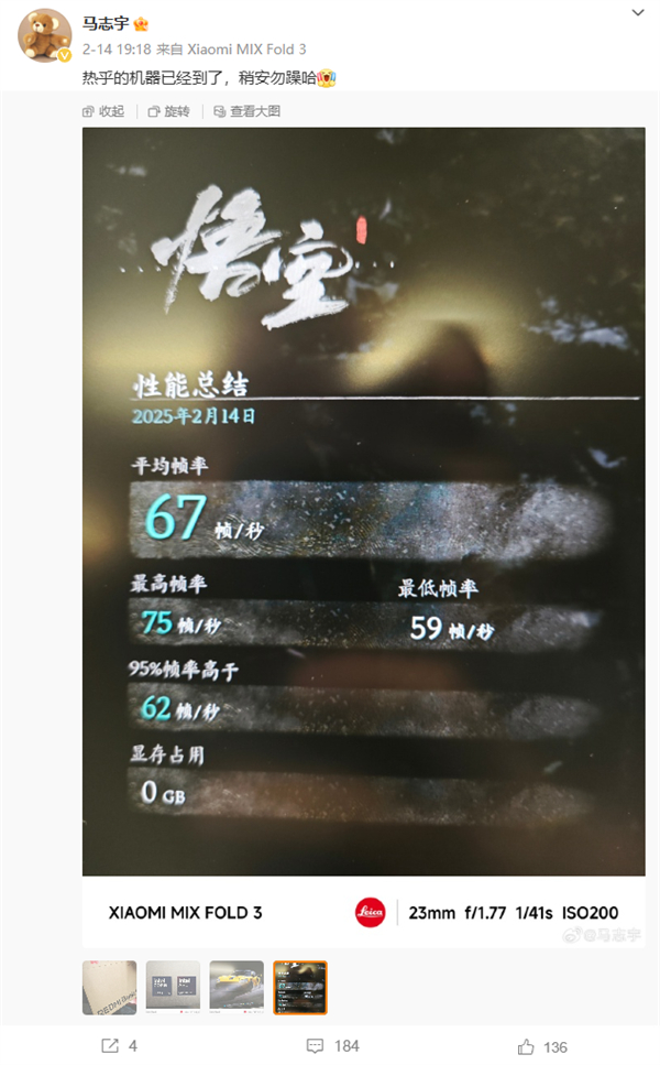 马志宇还分享了该笔记本玩《黑神话:悟空》的性能表现,游戏平均帧率67帧/秒、最高帧率75帧/秒、最低帧率59帧/秒。