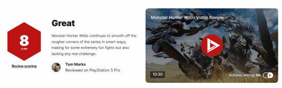 《怪物猎人:荒野》媒体口碑现已解禁,IGN为其打出了8分的成绩。