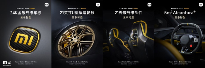 据IT之家今日早些时候报道,小米 SU7 Ultra 汽车全系标配 24K 金碳纤维车标、全系可选 21 英寸 U 型锻造轮毂、全系可选 21 处碳纤维部件、全系标配 5㎡Alcantara 超细纤维面料。