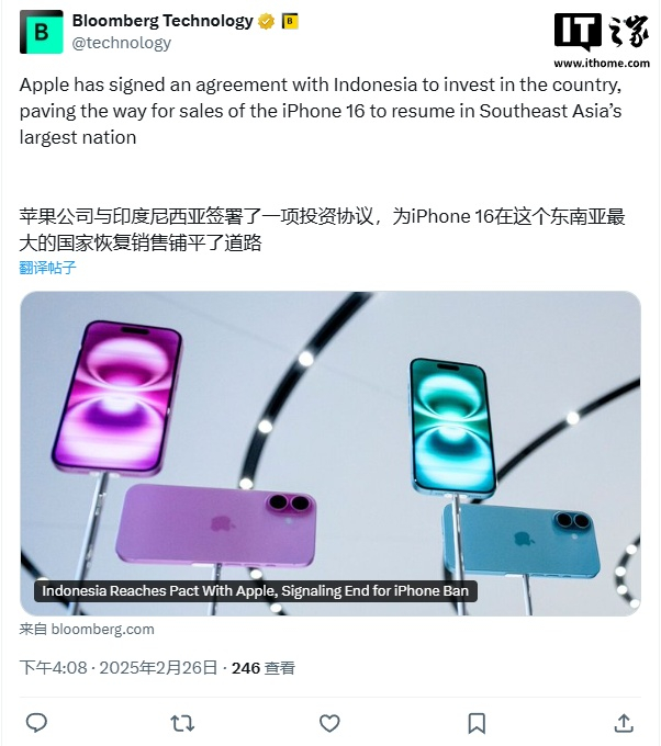彭博社报道称,印尼工业部长阿古斯今日宣布与苹果签署了一项投资协议,为 iPhone 16 在当地恢复销售铺平了道路。