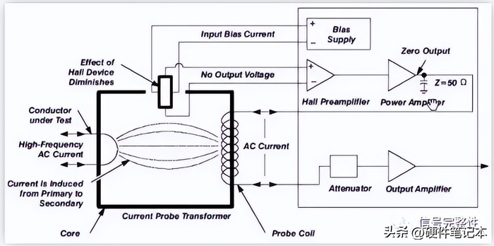 随着被测电流频率的增加,霍尔效应逐渐减弱,当测量一个不含直流成分的高频交流电流时,大部分是通过磁场的强弱直接感应到电流探头的线圈。此时,探头就像一个电流变压器,电流探头直接测量的是感应电流,而不是补偿电流,功放的输出为线圈提供一个低阻抗的接地回路。
