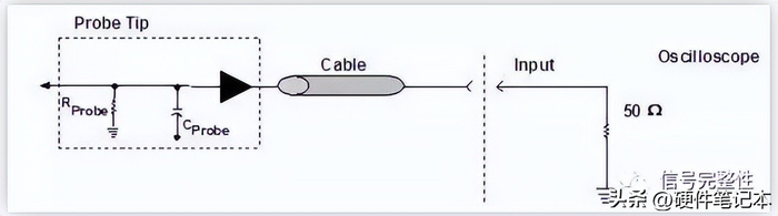 单端有源探头结构图如下,使用放大器实现阻抗变换的目的。单端有源探头的输入阻抗较高(一般达100Kohm以上),而输入电容较小(一般小于1pf),通过探头放大器后连接到示波器,示波器必须使用50ohm输入阻抗。