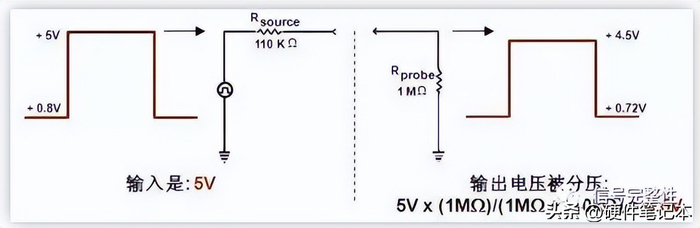 阻性负载相当于在被测电路上并联了一个电阻,对被测信号有分压的作用,影响被测信号的幅度和直流偏置。有时,加上探头时,有故障的电路可能变得正常了。一般推荐探头的电阻R>10倍被测源电阻,以维持小于10%的幅度误差。