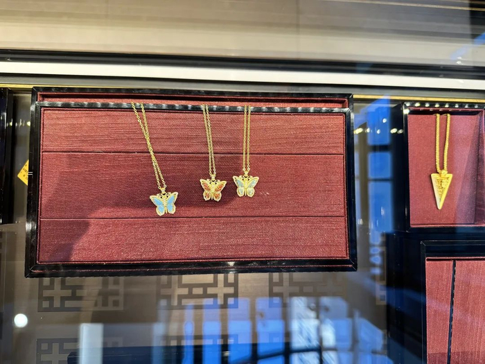 老铺黄金柜台陈列的热门蝴蝶样式黄金饰品。图源/财经天下