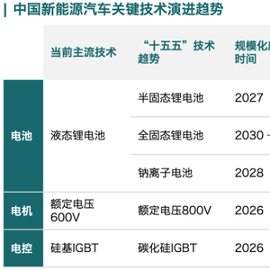 新能源汽车发展的第一步是电气化。电气化围绕两大系统:能源系统,转换系统。涉及电池、电机和电控(俗称“三电”)。实际上,我国汽车电气化的引领靠电池,关键在电控。我国经过多年“三横三纵”1技术研发布局,在“三电”技术方面已取得了突出成绩。预计“十五五”时期,我国新能源汽车整体技术水平有望大幅提升。