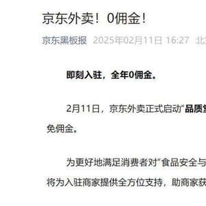2月11日,京东外卖正式亮相,同时启动了“品质堂食餐饮商家”招募计划,宣布2025年5月1日前入驻的商家可享受全年免佣金的优惠。这一“免佣金”策略直指行业痛点,显然是想在外卖市场的高佣金困局中撕开一道口子。
