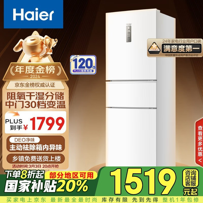 海尔255升三开门冰箱BCD-255WLHC35EWVU1小户型静音节能省电