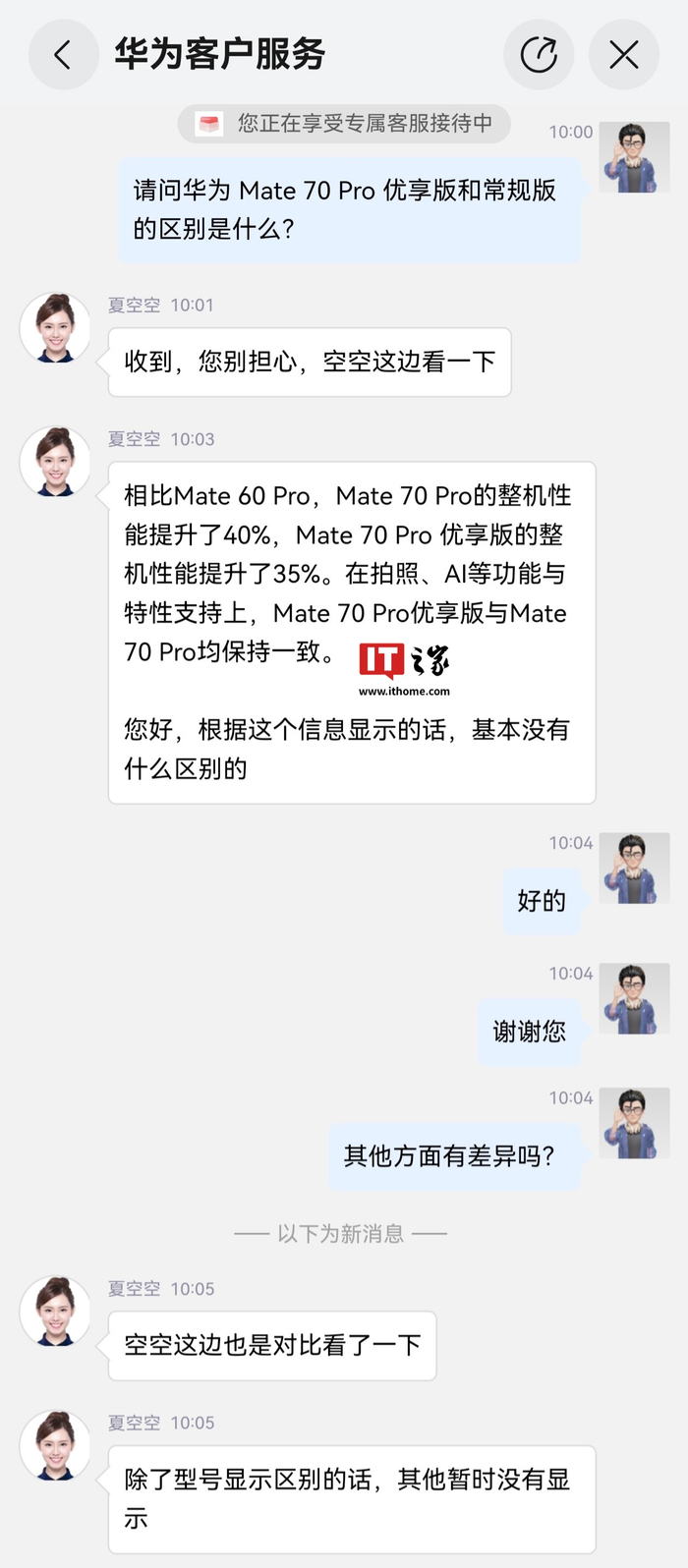 IT之家从华为客服获悉:相比 Mate 60 Pro,Mate 70 Pro 的整机性能提升了 40%、Mate 70 Pro 优享版的整机性能提升了 35%。在拍照、AI 等功能与特性支持上,Mate 70 Pro 优享版与 Mate 70 Pro 均保持一致。另外,客服还表示除了型号显示区别的话,其他暂时没有显示。