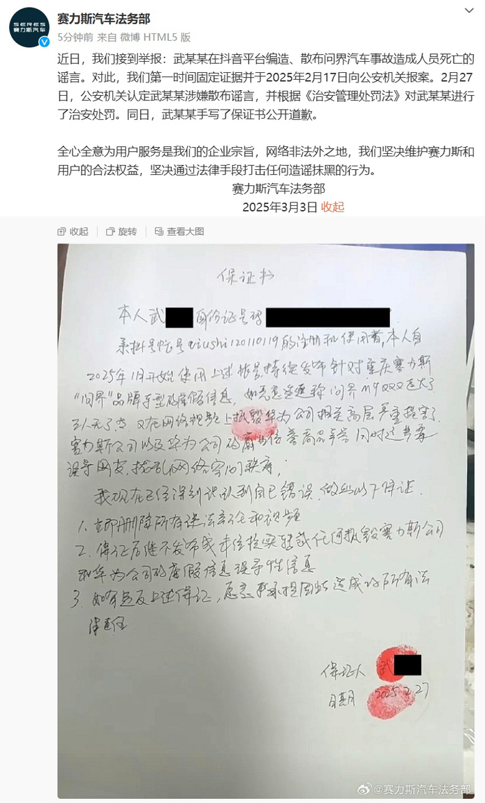 近日,我们接到举报:武某某在抖音平台编造、散布问界汽车事故造成人员死亡的谣言。对此,我们第一时间固定证据并于 2025 年 2 月 17 日向公安机关报案。2 月 27 日,公安机关认定武某某涉嫌散布谣言,并根据《治安管理处罚法》对武某某进行了治安处罚。同日,武某某手写了保证书公开道歉。