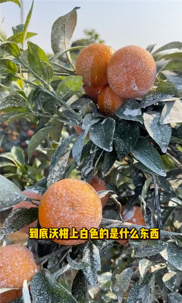 果农会在沃柑果实表面上喷洒石灰水,石灰水会在果实表面形成一层白色保护层,反射阳光,起到防晒作用,像极了人们夏季涂抹防晒霜隔绝阳光暴晒的样子。