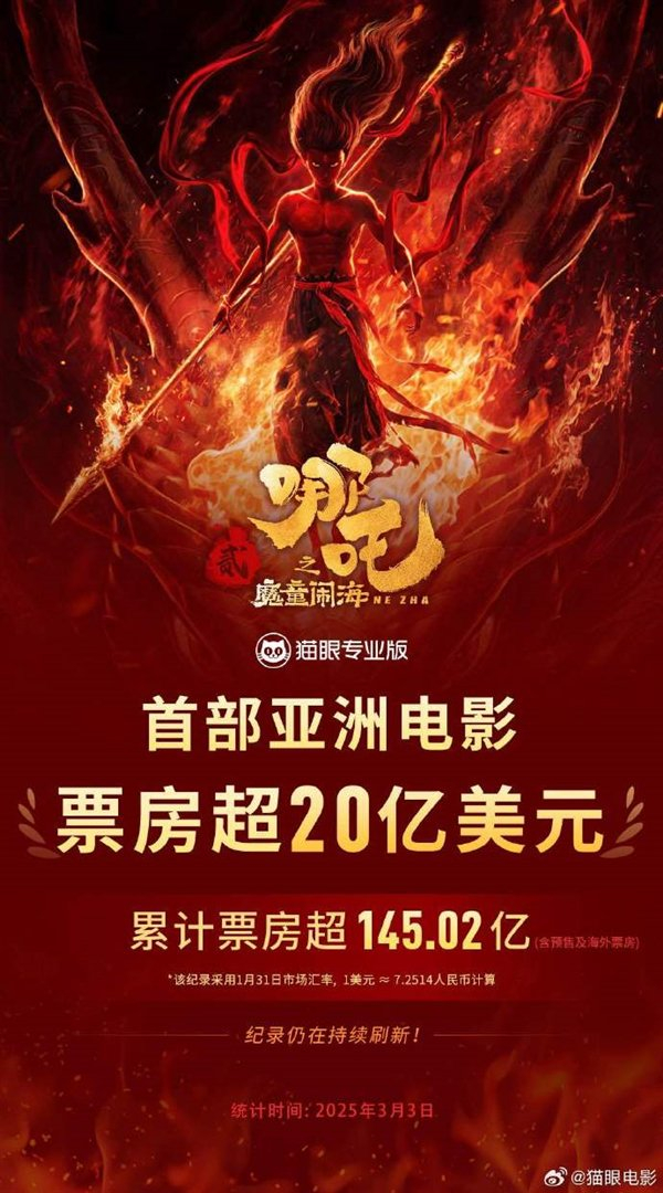 《哪吒之魔童闹海》累计票房超20亿美元 亚洲电影首部