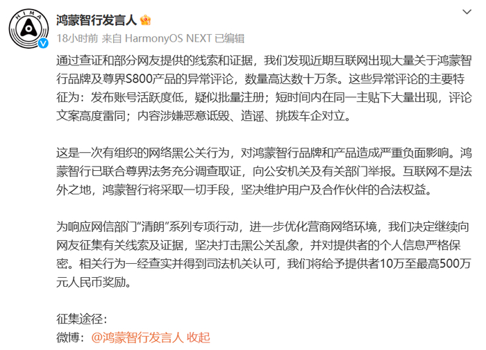 而在近日,自尊界S800技术发布会后,鸿蒙智行品牌及尊界S800产品遭遇有组织、有预谋的恶意抹黑现象。对此,官方账号@鸿蒙智行发言人 提到,异常评论数量高达数十万条,特征包括账号批量注册、文案高度雷同、内容涉及造谣与挑拨对立。