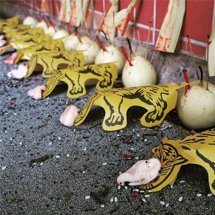白虎一般用黄纸做成,身上带有黑纹,口有撩牙。做好的白虎放在神坛前,拜祭时,把涂有猪血的肥猪肉抹在老虎的嘴巴上,寓意“吃足油水,就不会张口伤人了”。