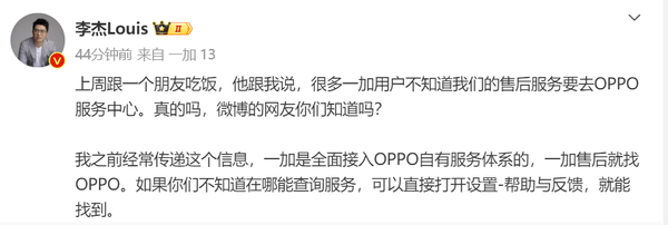 【CNMO科技消息】3月4日,一加中国区总裁李杰在微博发文称,上周和朋友吃饭时得知,很多一加用户不知道一加的售后服务可以在OPPO服务中心完成。李杰表示,他此前多次强调过,一加已全面接入OPPO自有服务体系,用户可以前往OPPO服务中心享受售后支持。如果用户不清楚具体位置,可以直接在手机的“设置-帮助与反馈”中查询相关信息。