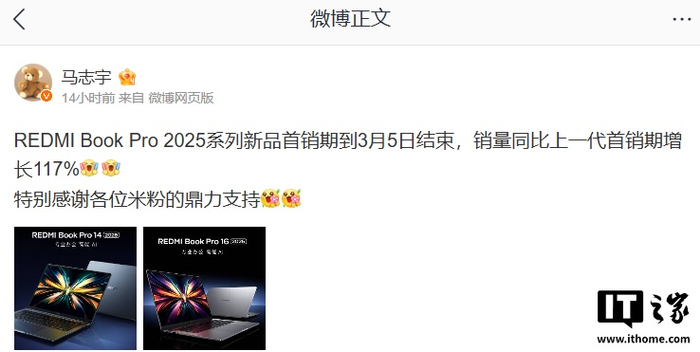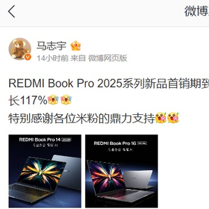 IT之家 3 月 6 日消息,小米通讯技术有限公司产品行销总监马志宇今日凌晨发文透露:REDMI Book Pro 2025 系列新品首销期到 3 月 5 日结束,销量同比上一代首销期增长 117%。