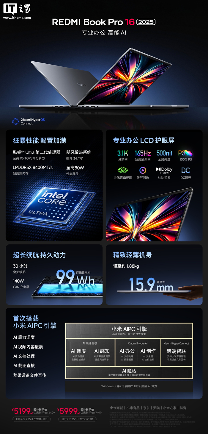 据IT之家此前报道,在上月(2 月 27 日)的发布会上,小米推出了全新的 REDMI Book Pro 14 / 16 2025 笔记本电脑,首批搭载第二代英特尔酷睿 Ultra 处理器,首发价 5699 元起,叠加国补 4559.2 元起。
