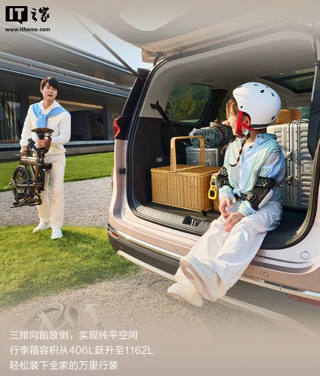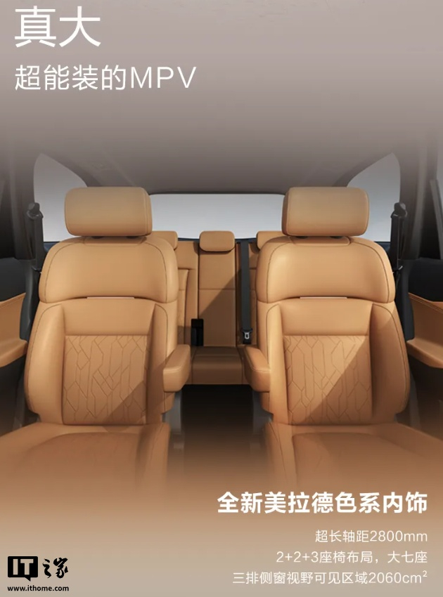 新车尺寸为 4825×1825×1778(带车顶行李架为 1800)mm、轴距 2800mm,采用 2+2+3 座椅布局、大七座设计,三排侧窗视野可见区域 2060cm²。G50 三排向前放倒,实现纯平空间,行李箱容积从 406L 提升至 1162L。