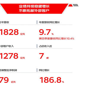 京东物流发布2024年年度业绩报告,全年营收达1828亿元,同比增长9.7%,第四季度营收达521亿元,同比增长10.4%。其中,2024年来自外部客户的收入为1278亿元,同比增长9.6%,占总收入比近7成,已服务外部一体化供应链客户超8万家。