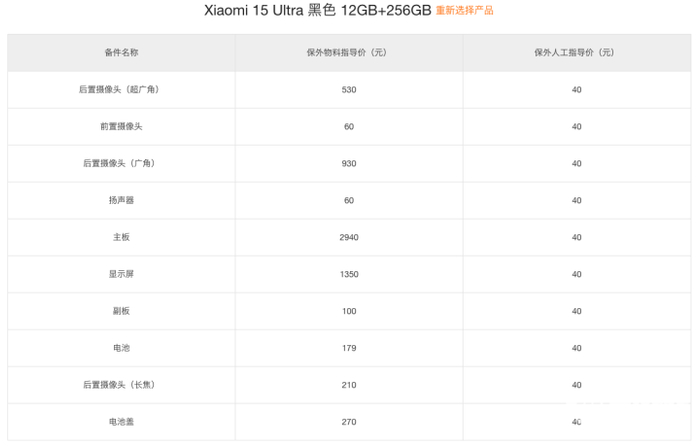 将12GB+256GB(入门版)小米15 Ultra的保外物料价格相加,总价为6629元。对比而言,12GB+256GB(入门版)小米15 Ultra的售价为6599元。由此来看,小米15 Ultra的“零整比”为103%,维修时,并无太多溢价。
