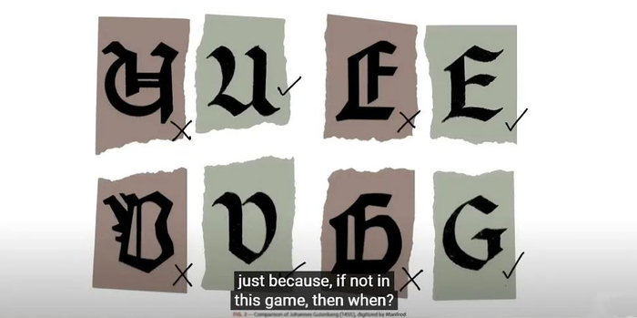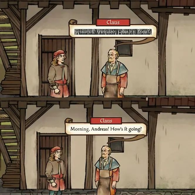 作为一款背景放在中世纪的RPG,《隐迹渐现》根据不同角色的阶层、身份和状态设计了五种风格化字体(Stylized Fonts),开发团队在这些字体的可读性和准确性之间做了平衡的微调,特别是印刷体和抄写体,让大家看起来不那么难以分辨——虽然就算如此,对非母语者来说,难度依然不小。