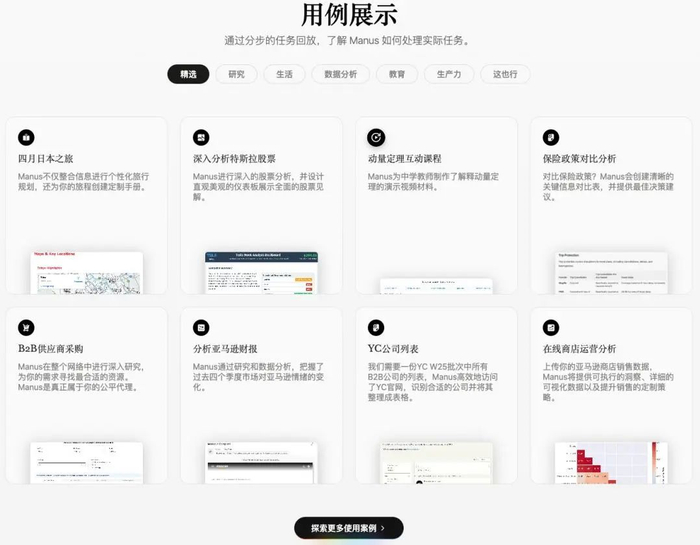 Manus官方将自己定义为一款连接思维与行动的通用人工智能代理,特点是擅长处理各种任务,不仅能思考(听懂复杂指令进行推理),还能交付成果(顺滑对接完成该任务的各个环节,将最终结果给到用户)。