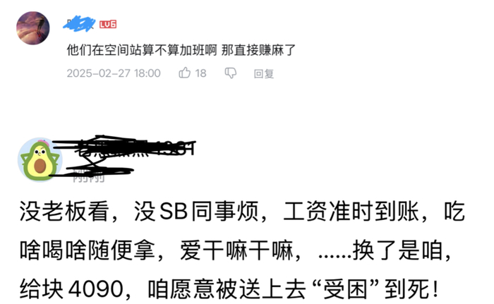 近一年时间的太空流浪,对身体、尤其是心理的挑战可想而知。网络舆论除了对两位宇航员遭遇的同情和担忧以外,也有不少来自社畜牛马们的“逆向共情”:“给我块4090,我愿意被送上去一直受困。”