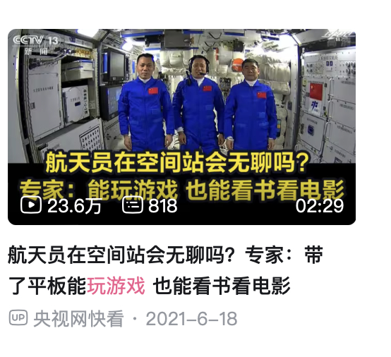 至于凝聚着中华民族浪漫宇宙观的“天宫”——中国空间站中的航天员,是否在闲暇之余能过把游戏瘾,央媒上的专家更是斩钉截铁的说过“可以”。