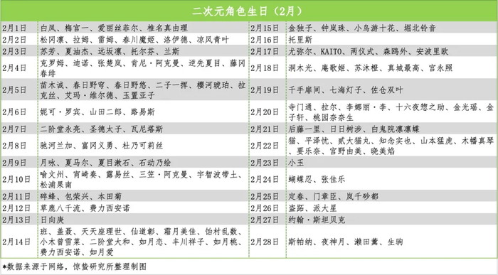 如今,随着玩家群体的不断壮大,“投放生日大屏”也逐渐发展成一种常见的应援方式,甚至有网友专门统计了生日预告。而据惊蛰研究所观察,仅2月份就有超过120位二次元“寿星”,3月份的“寿星”数量也已突破100位,《恋与深空》男主角祁煜也是其中之一。