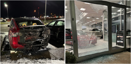 在俄勒冈州Salem的特斯拉门店,一个月内两次遭受枪击。监控显示有嫌犯拿着半自动步枪对着特斯拉门店射击,子弹击碎了门店的落地玻璃,打在了门店内的车身。所幸非工作时间店内没有员工。此外,他还拿着自制燃烧瓶试图焚毁电车,造成七辆特斯拉受损,损失接近50万美元。嫌犯已经被捕。
