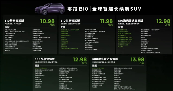 新车共推出5款车型,售价区间为10.98-13.98万元,全系标配智驾功能。其中,12.98万元的510智驾版,就配备了激光雷达高阶智驾,零跑B10可以说击穿了国内激光雷达智驾车型的底价。