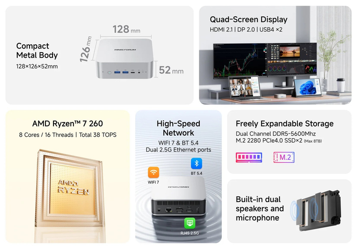 AI X1 内置双 DDR5-5600 SO-DIMM 内存插槽,拥有 2 个 M.2 2280 PCIe 4.0 NVMe 盘位,配备 2.5GbE 有线网卡和支持 Wi-Fi 7 与蓝牙 5.4 的无线网卡。