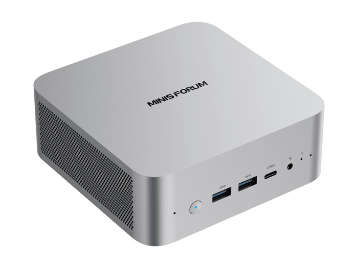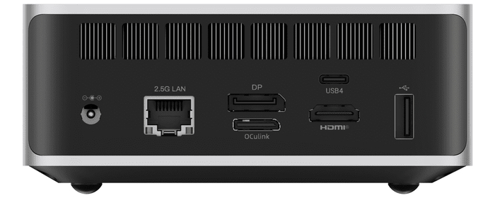 该迷你主机前方提供电源键、2 个 USB-A 10Gbps、1 个 USB4、1 个 3.5mm 音频插孔和一对数字麦克风孔;后方则包含 DC-in 供电口、2.5GbE RJ45、DP 2.0、OCuLink、另一个 USB4、HDMI 2.1 FRL 和 1 个 USB-A 480Mbps。