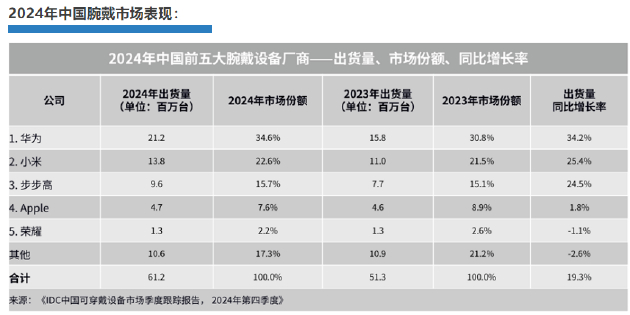 根据IDC最新发布的《全球可穿戴设备市场季度跟踪报告》,尽管2024年全球腕戴设备市场出货1.9亿台,同比下滑1.4%,中国市场却逆势增长,出货量达6116万台,同比增长19.3%,稳居全球最大腕戴设备市场地位。在这一市场中,华为表现格外突出,已连续五年稳居中国市场出货量第一,2024年出货量同比增长率高达33.6%,位居全球第一。