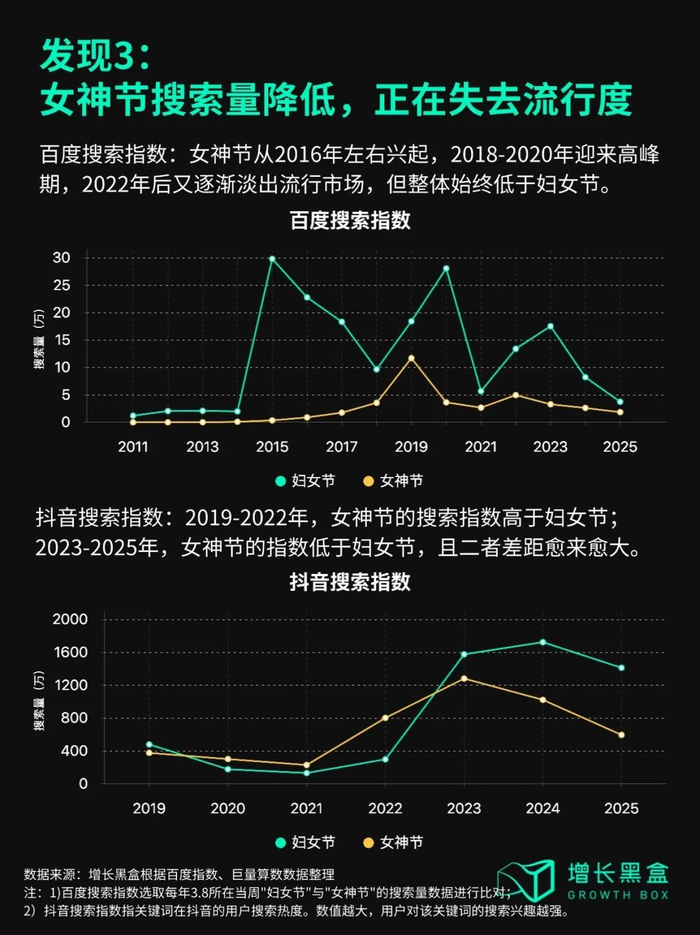 在抖音,2019-2022年,3.8当天“女神节”的搜索指数是高于“妇女节”的,而2023-2025年,“女神节”的搜索指数不仅低于“妇女节”,且二者的差距越拉越大。