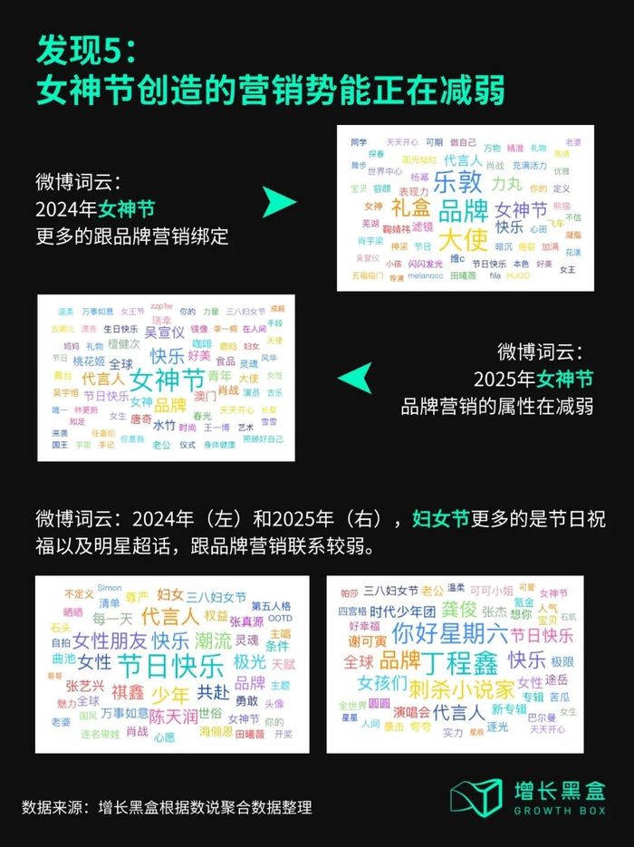 微博的词云证实了我们的推测:23、24年,“女神节”大多跟品牌营销绑定,妇女节则更多的是祝福以及明星超话;到了25年,“女神节”相关的品牌营销明显减弱,略微开始向“妇女节”转移。