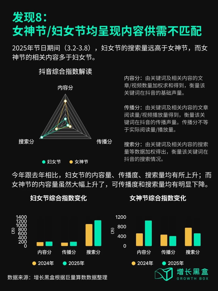 此外,今年3.8,抖音短视频的内容供给端和消费端呈现出明显的错位——用户更喜欢搜“妇女节”,而大量内容却是围绕“女神节”创作的。这对营销操盘手来说也是有价值的洞察。