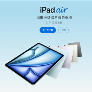 4799元起 苹果全新iPad Air开售:M3芯片 性能最高提升4倍