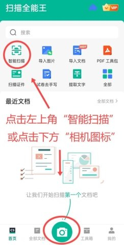 打开软件后,可以在上方工具箱找到“智能扫描”,或者直接点击下方的相机图标,进入扫描界面。