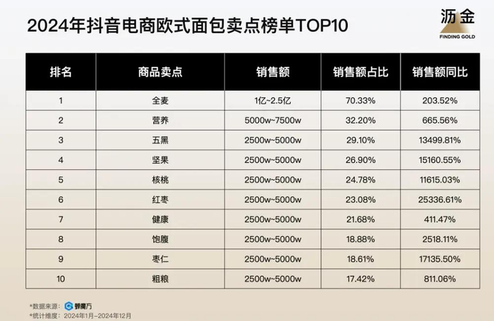 目前,以面包为例,根据2024年抖音电商欧式面包卖点榜单,位列前十的均与营养、健康相关,其中全麦面包更以1亿多的销售额位列榜首。