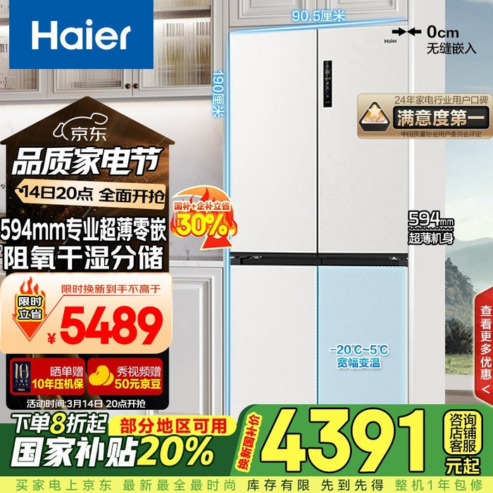 海尔516L风冷十字对开门冰箱山茶花系列促销