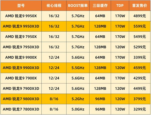 价格方面,AMD锐龙9 9950X3D国内售价5599元,AMD锐龙9 9900X3D 国内售价4599元,AMD锐龙9 9950X3D毫无疑问是AMD目前首发最贵的一款消费级处理器。