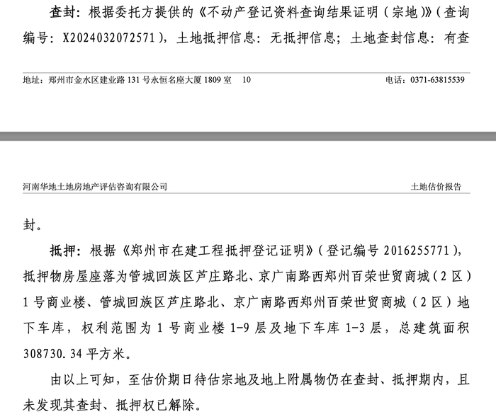 土地估价报告显示,百荣商城C座仍在查封、抵押期内。