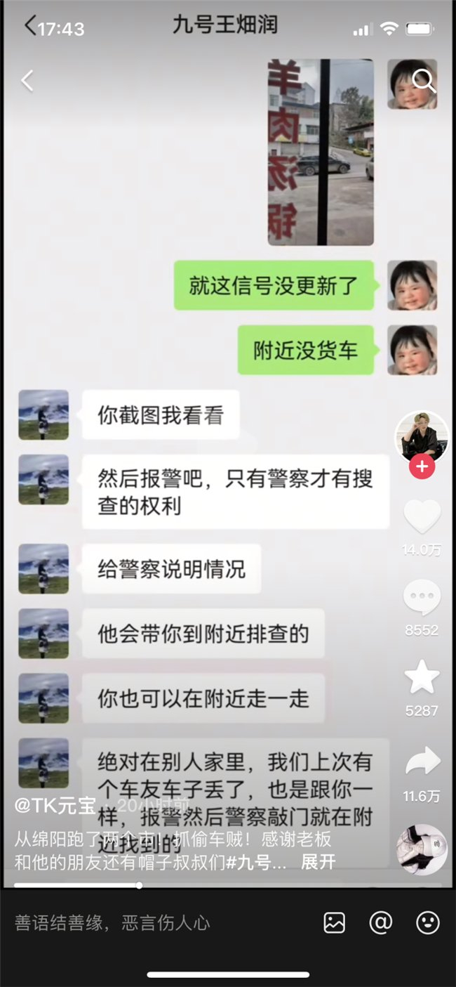 事件经过是这样的:3月12日凌晨,某社交平台用户“TK元宝”的九号电动摩托车C85C被盗。早上8点,手机上收到了九号于凌晨5点发出的车辆异动提醒短信,发现车辆失窃,她立即联系了购车的四川江油九号门店。门店老板迅速响应,协助车主通过“九号出行”APP启动车辆定位,实时追踪显示,九号电动车被盗车辆正向南充方向移动。