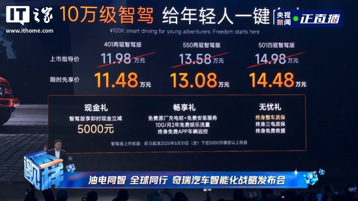 官方还宣布,即日起至 2025 年 5 月 31 日,iCAR V23 智驾版大定用户可享现金立减 5000 元,并获得“无忧用车套装”,包括免费原厂充电桩及安装服务、2 年 10G / 月娱乐流量、终身免费 App 车辆远控、终身整车 + 三电质保以及免费救援服务。购买非智驾版车型的用户可享 20000 积分 / 2000 元置换。所有购车用户还将获赠实体蓝牙钥匙一把(含已提车用户)。前期已选购带智驾包车辆的车主,近期可通过 OTA 免费升级猎鹰智驾 500 系统。