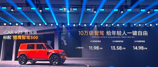 IT之家 3 月 18 日消息,奇瑞 iCAR V23 智驾版上市,标配猎鹰智驾 500 ,共推出 401 两驱智驾版、550 两驱智驾版和 501 四驱智驾版三款车型,指导价分别为 11.98 万元、13.58 万元和 14.98 万元,限时优惠 5000 元。