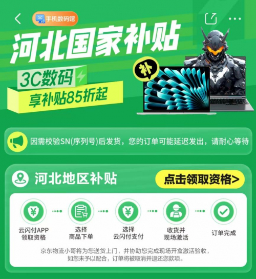 具体领取与使用流程为:在河北省的消费者打开云闪付APP,定位为河北,选择“河北焕新潮”,选择进入对应城市,选择“数码3类”点击领券,领取对应品类“补贴资格”。领取后,消费者在京东APP搜索“河北3C国家补贴”进入活动会场浏览选购,也可直接搜索符合要求的商品选购,收货地址在河北,使用云闪付完成支付,即可享受补贴。