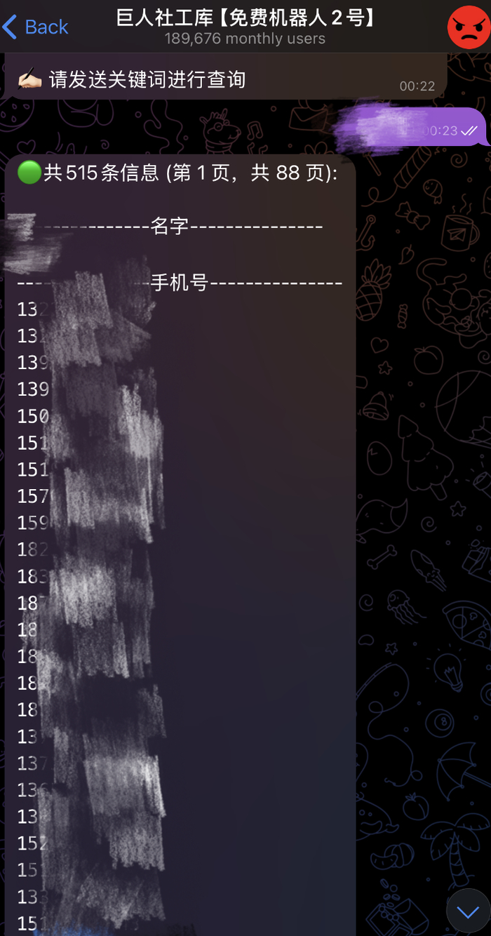 顺着使用指南,蓝鲸记者仅输入了自己名字,随即便出现515条手机号,共计88页信息,其中记者的手机号赫然在列,如果要获取更多信息则需要付费。