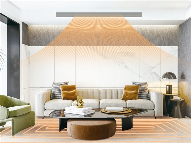 这套东芝中央空调系统在送风舒适度上也表现出色,冬季,地面辐射供暖联动室内机一同制热,高效驱动暖气流循环,迅速提升室内温度并实现均匀分布,真正做到“从脚暖到头”,契合中式养生理念。而在夏季,设备启动后,冷风从空调顶部轻柔扩散,迅速覆盖整个空间,均匀驱散室内燥热空气,营造出清爽宜人的温度环境,让居家更安逸。