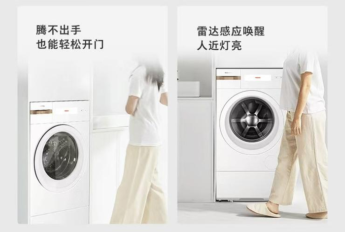 创新三变频全嵌热泵洗烘一体机的设计也充分考虑了人体工学。集成后产品高度更符合人体工学需求,洗衣机取物口高度0.55m、面板操作高度1.05m,放取衣物不弯腰、操作更便捷,极大提升了用户使用的舒适度。全新push门设计,不用手也可以轻松开门,新搭载的雷达感应可以做到人近灯亮轻松唤醒机器。