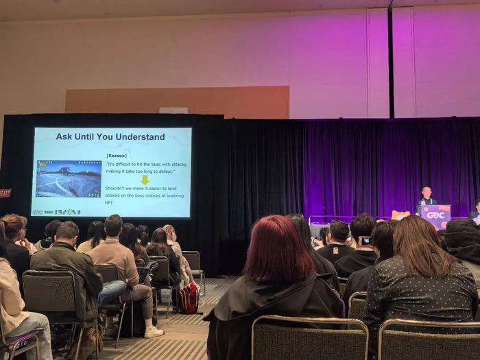 冨永在此举了两个例子。其中一个例子是设计师认为“Boss设计得太难,应该削弱Boss血量”,但冨永没有直接肯定或否定这一提议,而是反问设计师“为什么选择降低Boss血量”。